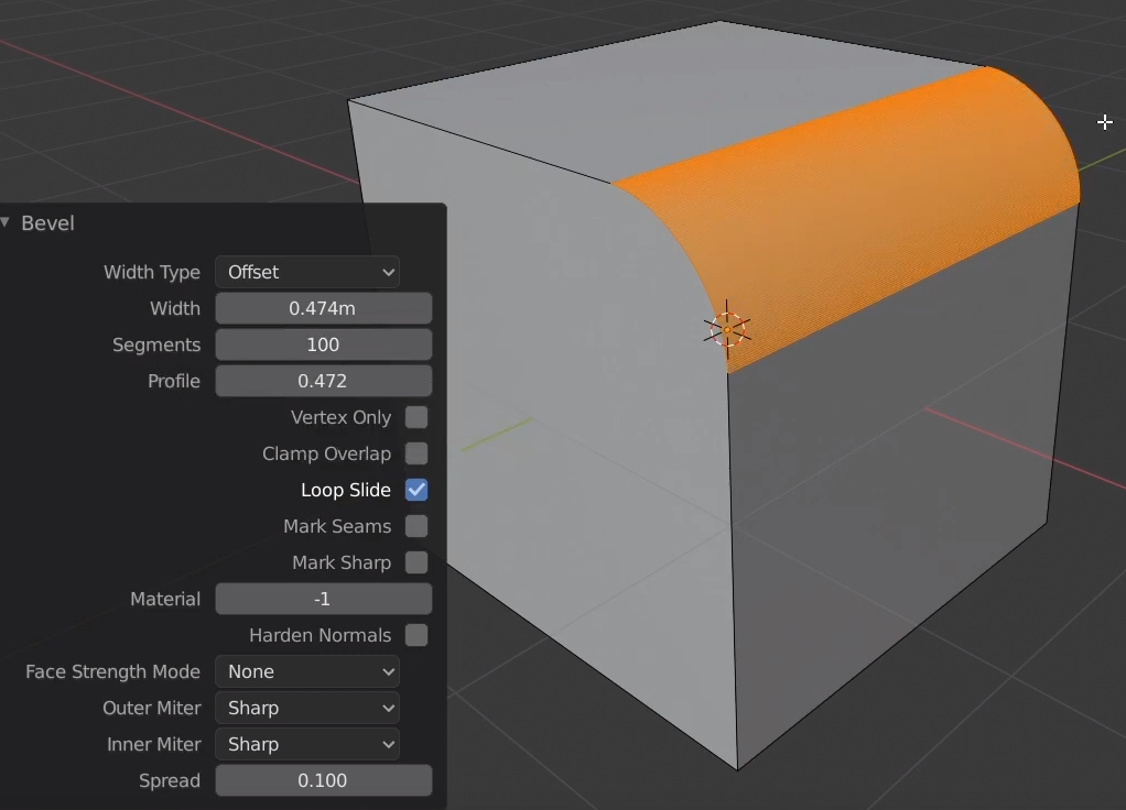 - Edge > Bevel Edges (Ctrl+B)로 곡선을 만들고 마우스 왼쪽 클릭으로 확인